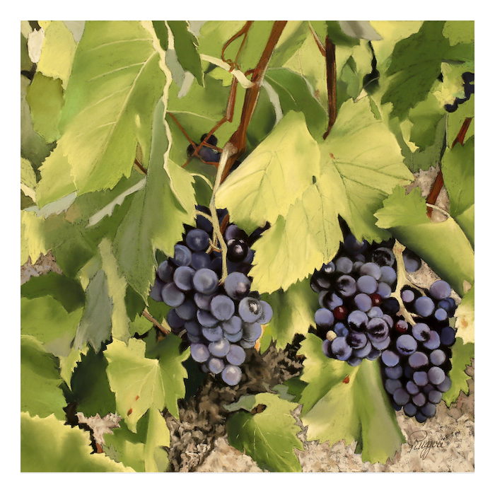 En attendant, le peintre saisit le privilège d'une autre gamme. Infinie. Du vert pale au vert olive, de l'émeraude au jade. D'un ton parfois acide, parfois lavé ou cru, mais toujours, toujours en accord avec le sol qui nourri le pied de la vigne.